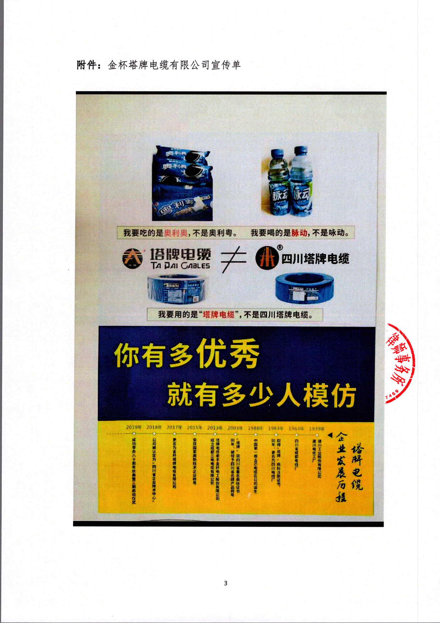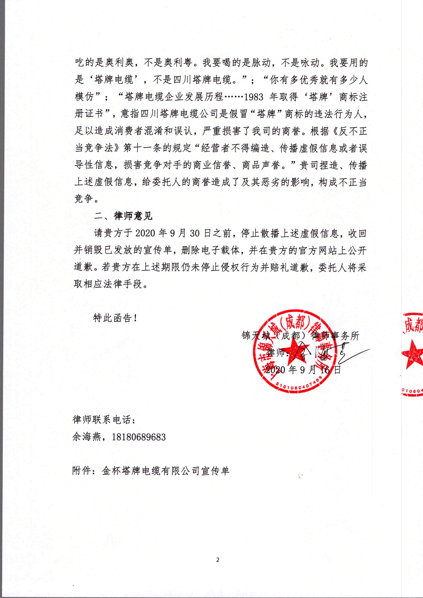 四川塔牌電纜公司致金杯塔牌電纜公司及旗下經銷商的律師函